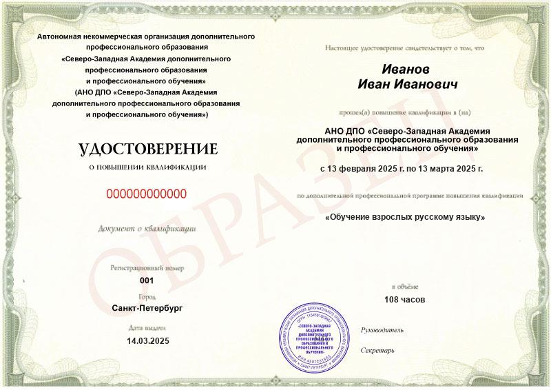 Каждый документ (диплом/удостоверение/свидетельство) соответствует п.2 ст.60 N-273 ФЗ. Диплом/удостоверение/свидетельство оформляется на русском языке, печатается на типографском бланке, защищённом от подделок. Ставится официальная печать образовательной организации. С образцами документов можно ознакомиться на сайте в разделе «Лицензия и документы».