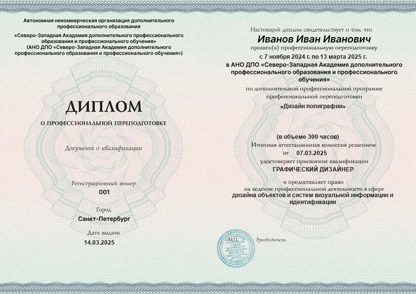 Каждый документ (диплом/удостоверение/свидетельство) соответствует п.2 ст.60 N-273 ФЗ, оформляется на русском языке, печатается на типографском бланке, защищённом от подделок. Ставится официальная печать образовательной организации. С образцами документов можно ознакомиться на сайте в разделе «Лицензия и документы».