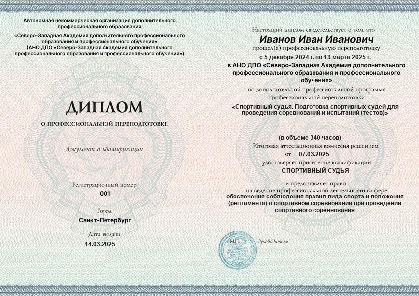 Курс обучения Спортивный судья. Подготовка спортивных судей для проведения соревнований и испытаний (тестов) (340ч)